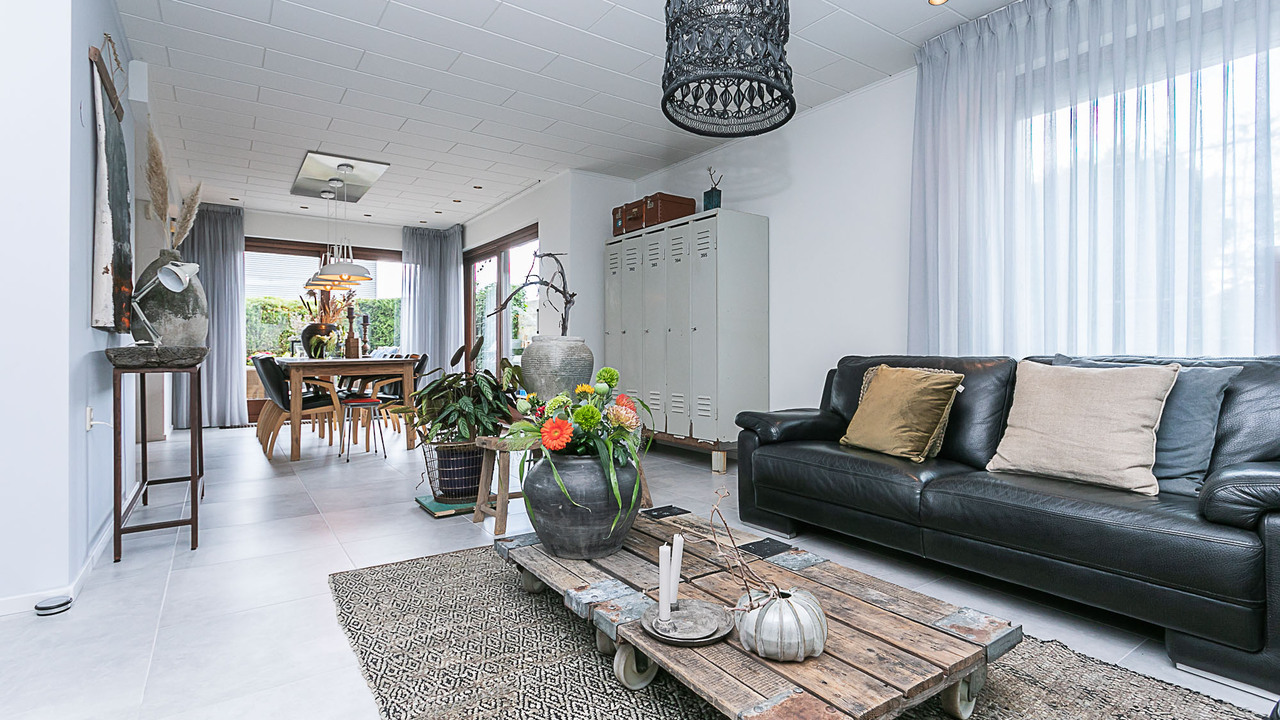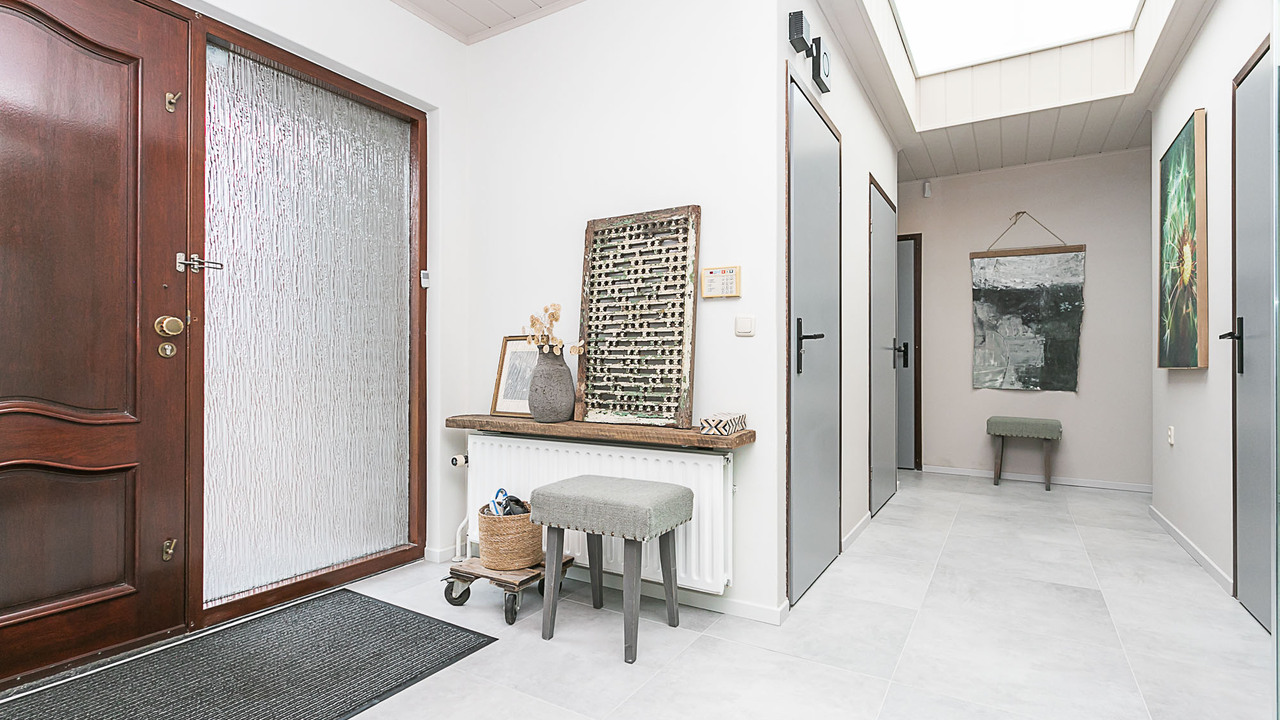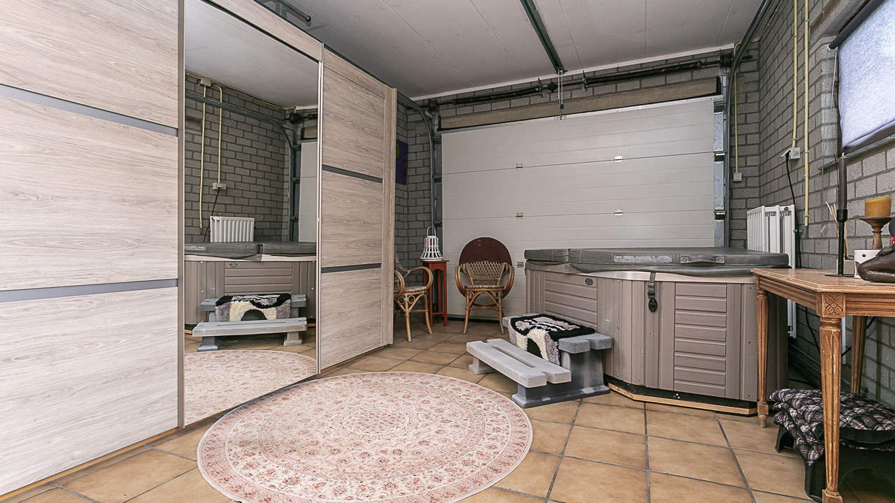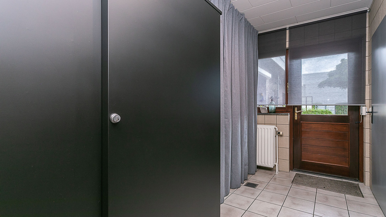 Hal, meterkast, 3 slaapkamers (ca. 15, 12 en 9 m²), betegeld toilet met keramisch duoblok toilet met fonteintje, betegelde badkamer (ca. 9 m²) met ligbad, douche met douchecabine, vaste wastafel in wastafelmeubel en 2e toilet, bijkeuken met aansluiting voor witgoed, woonkamer (ca. 35 m²) en keuken (12 m²) met tegelvloer, strak gestucte wanden en nieuwe plafonds. De open keuken is voorzien van een inbouwkeuken met apparatuur (keramische kookplaat, wasemkap, oven, magnetron, koelkast en vaatwasser. Via de keuken, woonkamer (2 schuifpuien) en de bijkeuken is de beklinkerde tuin bereikbaar en de garage (ca 24 m²) en via een poort de toegang naar de bedrijfsruimte.
