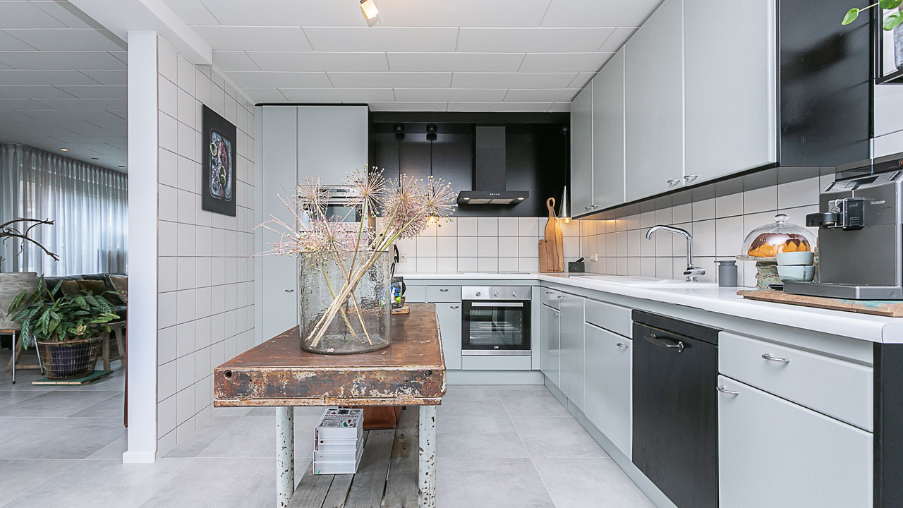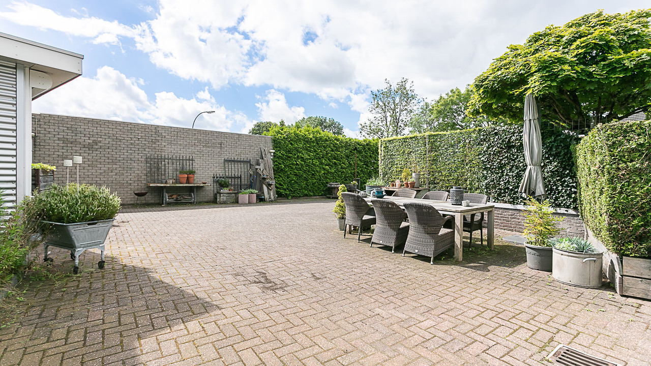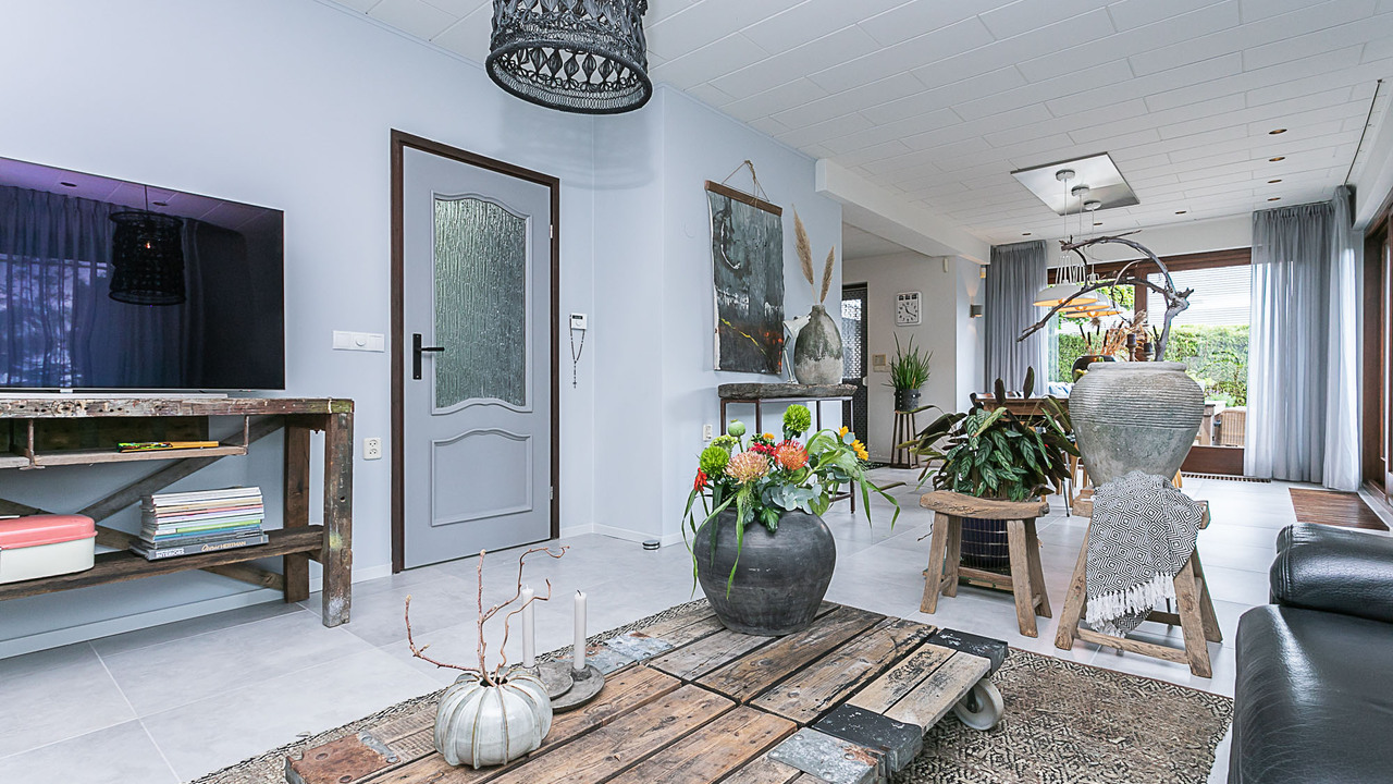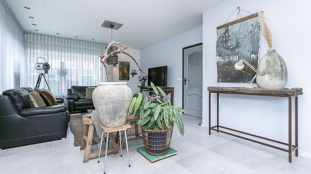 Hal, meterkast, 3 slaapkamers (ca. 15, 12 en 9 m²), betegeld toilet met keramisch duoblok toilet met fonteintje, betegelde badkamer (ca. 9 m²) met ligbad, douche met douchecabine, vaste wastafel in wastafelmeubel en 2e toilet, bijkeuken met aansluiting voor witgoed, woonkamer (ca. 35 m²) en keuken (12 m²) met tegelvloer, strak gestucte wanden en nieuwe plafonds. De open keuken is voorzien van een inbouwkeuken met apparatuur (keramische kookplaat, wasemkap, oven, magnetron, koelkast en vaatwasser. Via de keuken, woonkamer (2 schuifpuien) en de bijkeuken is de beklinkerde tuin bereikbaar en de garage (ca 24 m²) en via een poort de toegang naar de bedrijfsruimte.
