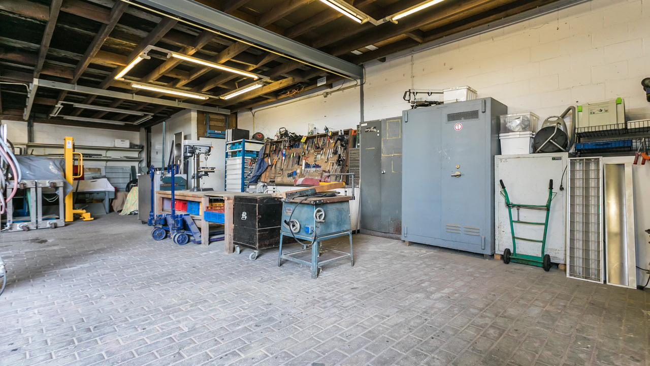 De primaire ruimte is ongeveer 890 m² (VVO) groot (57,44 x 15,44 m) en beschikt over een beklinkerde vloer, diverse kantoorruimtes, showroom en extra bergruimte/showroom op de verdieping. Het pand is grotendeels gemetseld met spouw en voorzien van stalen spanten, toiletruimte en eigen elektravoorzieningen. In de showroom is een pelletkachel geplaatst. De vrije hoogte bedraagt ruim 4 meter. Aan de achterzijde van dit pand bevindt zich nog een spuitcabine met toebehoren (ca 15 x 5 meter) en een overdekte stalling van ca 13,00/11,00 x 20 meter. De toegankelijkheid is goed gewaarborgd door een ruime beklinkerde oprit.