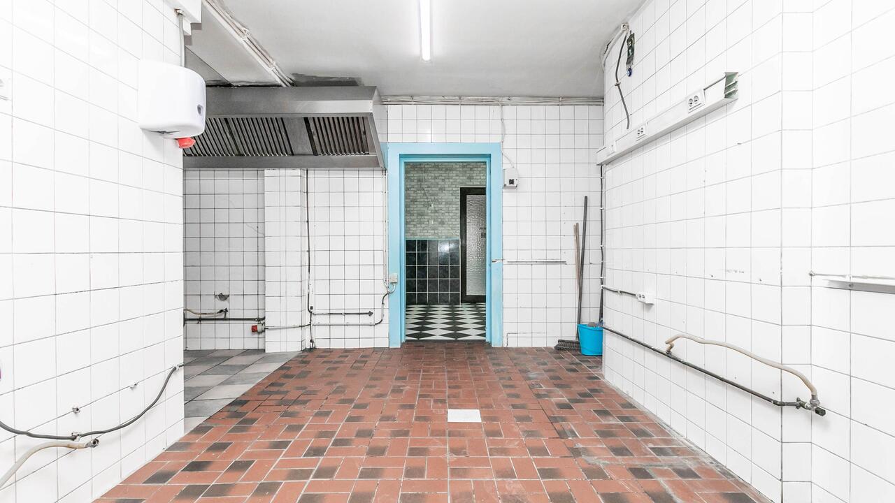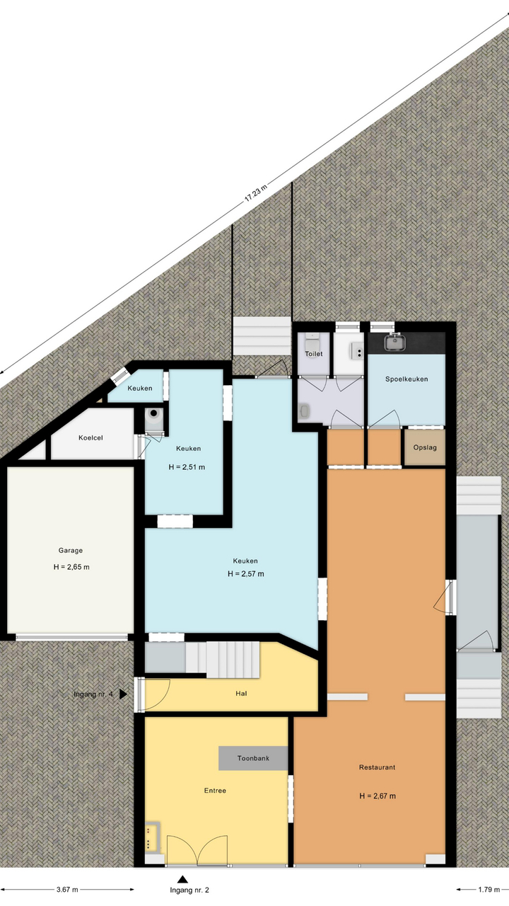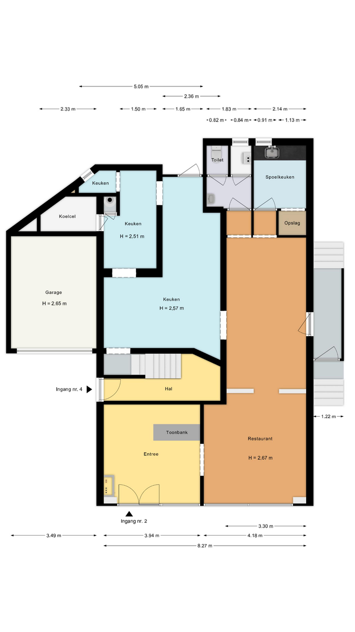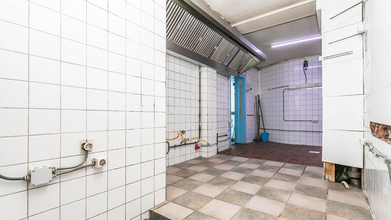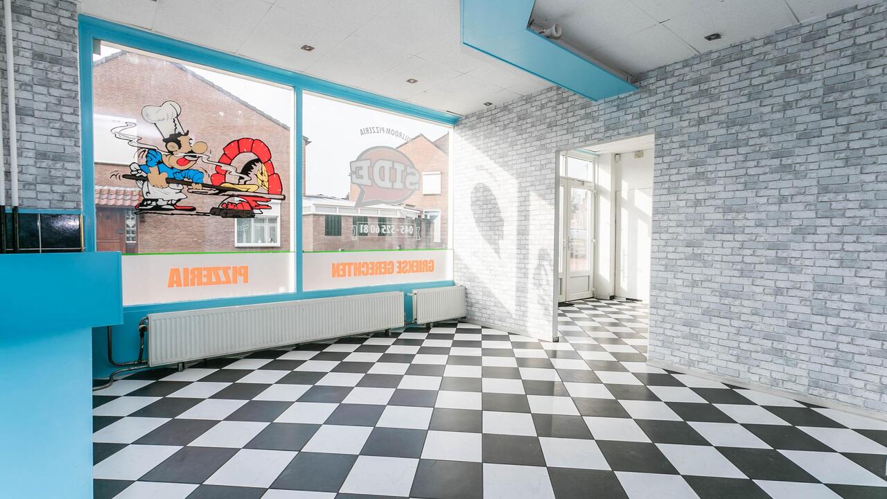 De bedrijfsruimte is momenteel ingericht als restaurant (4.18/3.30*10.85m). Middels de ruimte entree (3.94*4.04m) is het restaurant bereikbaar. Aansluitend bevinden zich hier een opslagruimte, spoelkeuken (2.56*2.14m) toilet en een technische ruimte. De ruime L- vormige keuken (ca.4.18/2.36*7.00m) met een aparte dichte keuken (ca. 3.50*2.00m) met een naastgelegen koelcel (1.42*2.33m) Via de L-vormige keuken is de tuin (ca.17.23*1.85/4.00m) bereikbaar welke geheel beklinkerd is en omsloten waardoor er veel privacy is. Aangebouwde garage (4.58*3.49m).
